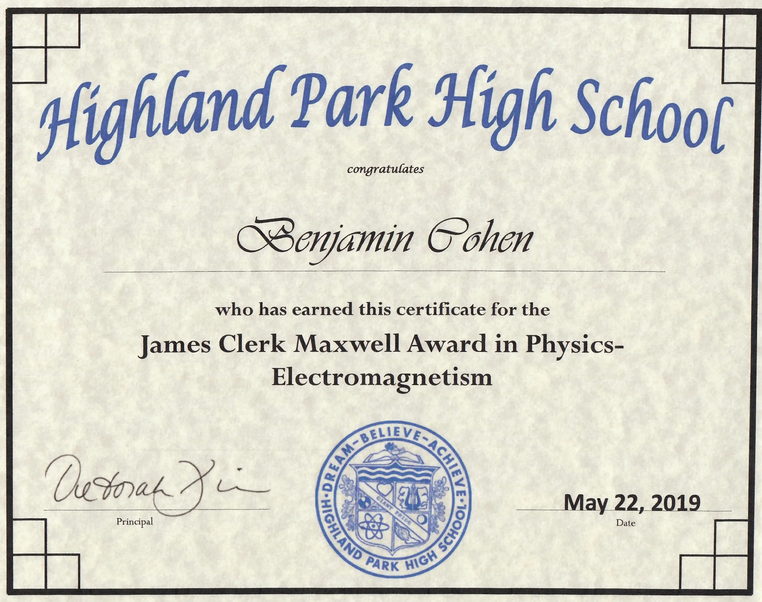JAMES CLERK MAXWELL AWARD IN PHYSICS - HPHS RECIPIENT